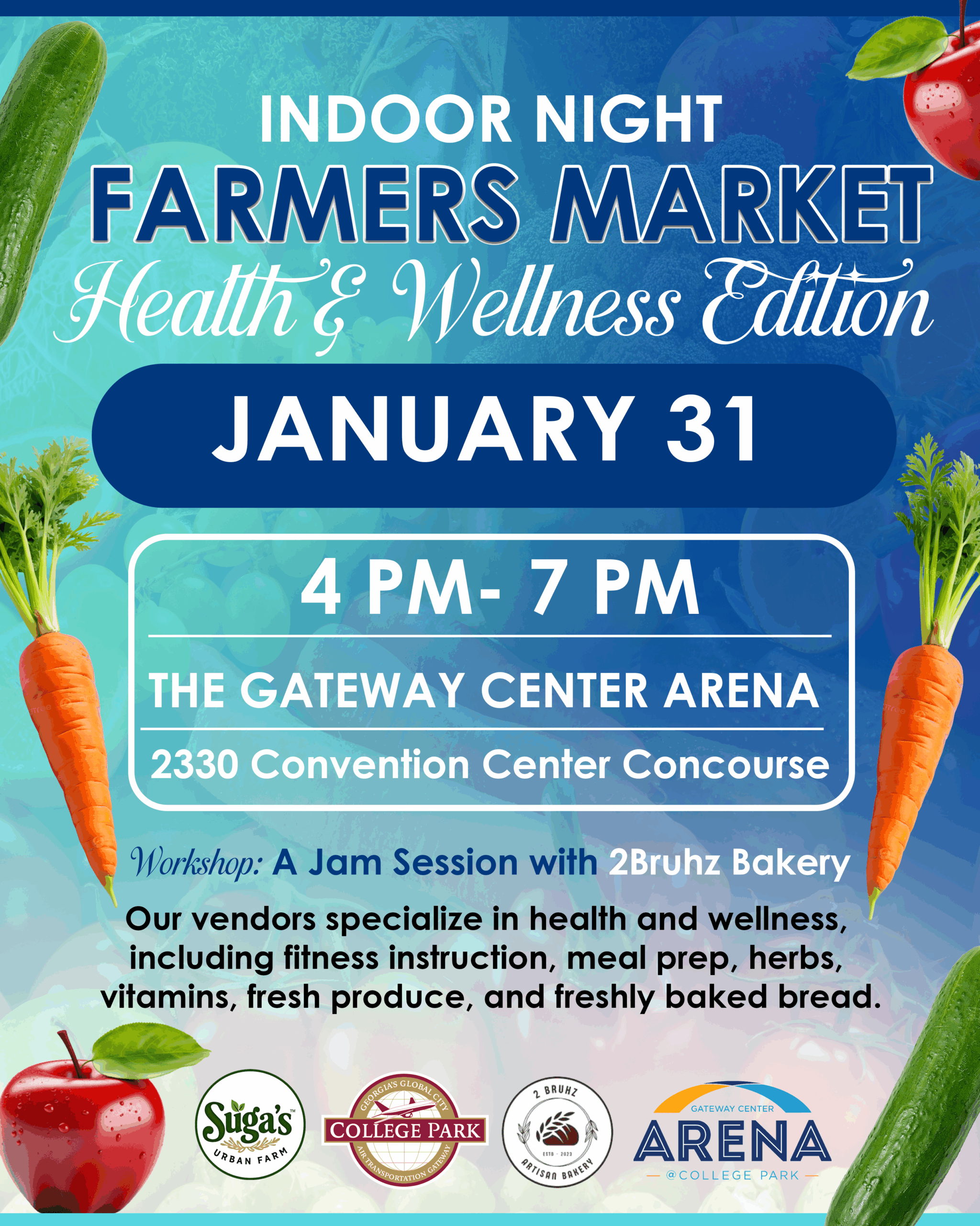 Arena at Gateway Center 2330 Convention Center Concourse, College Park, GAWorkshop: A Jam Session with 2Bruhz Bakery Our vendors specialize in health and wellness, including fitness instruction, meal prep, herbs, vitamins, fresh produce, and freshly baked bread.